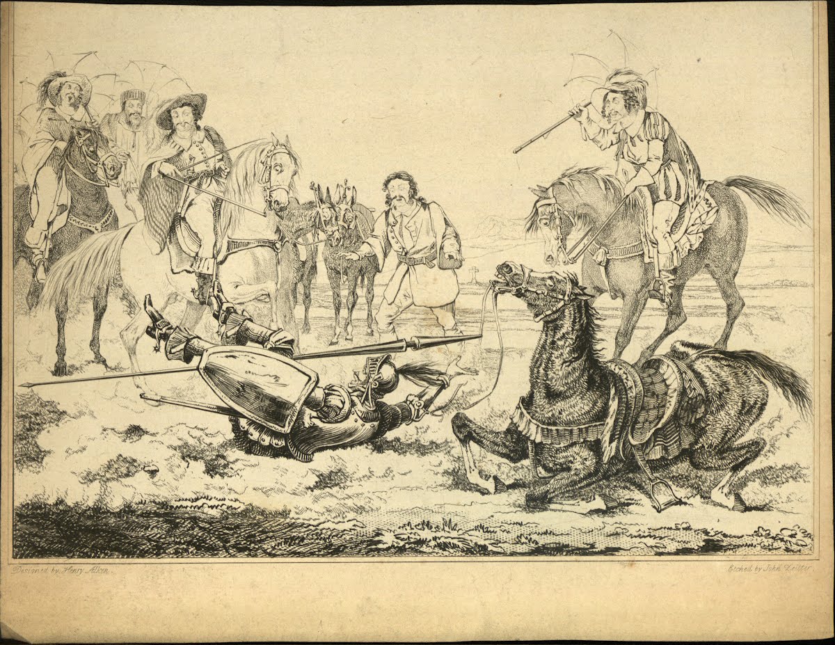 Y diciendo esto arremetió con la lanza baja contra el que lo había dicho, con tanta furia y enojo, que si la buena suerte no hiciera que en la mitad del camino tropezara y cayera Rocinante, lo pasara mal el atrevido mercader (comerciante). Cayó Rocinante, y fue rodando Don Quijote una buen tramo por el campo; y queriéndose levantar, jamás pudo, impedido por el peso de las antiguas armas. Y entre tanto que luchaba por levantarse decía: